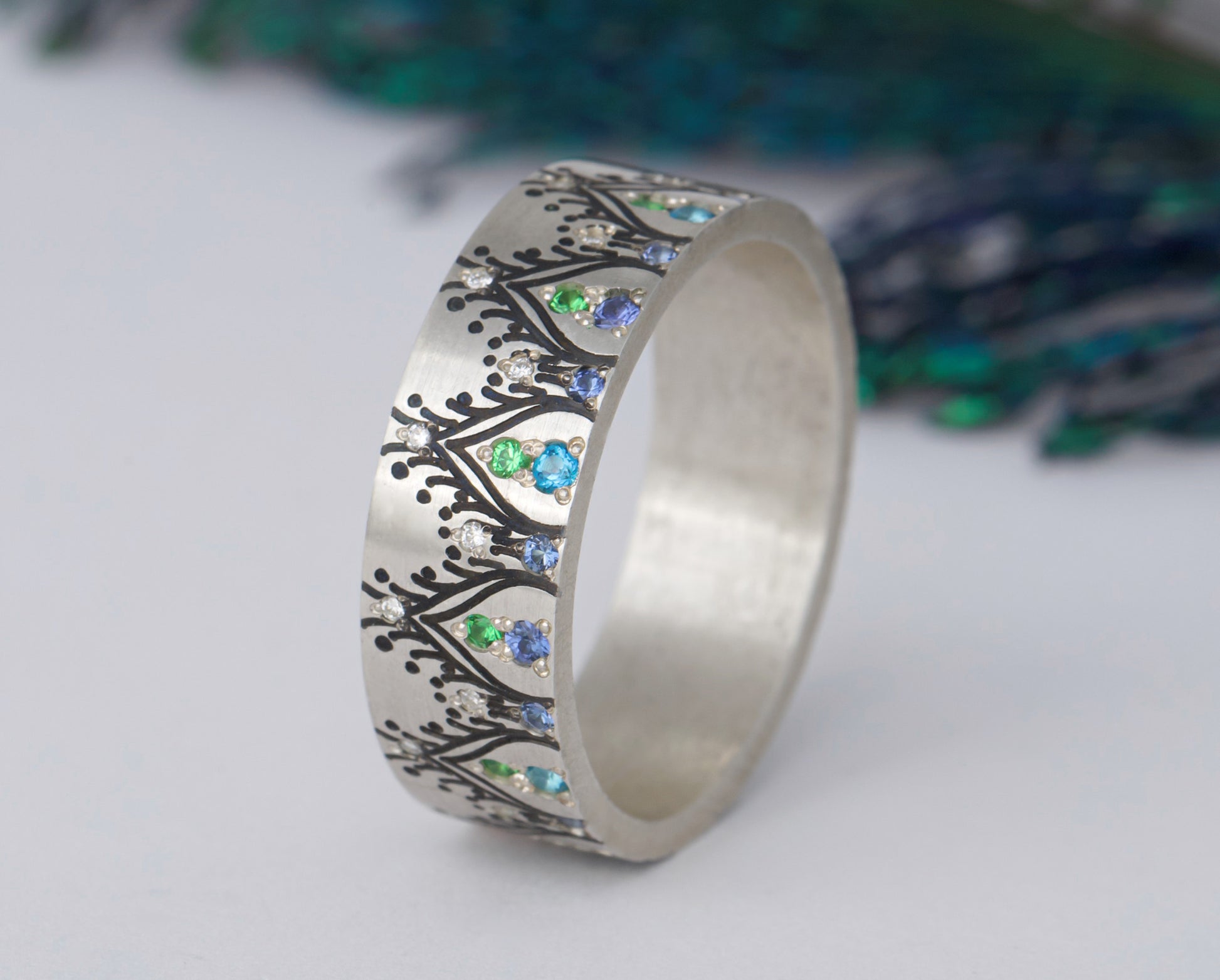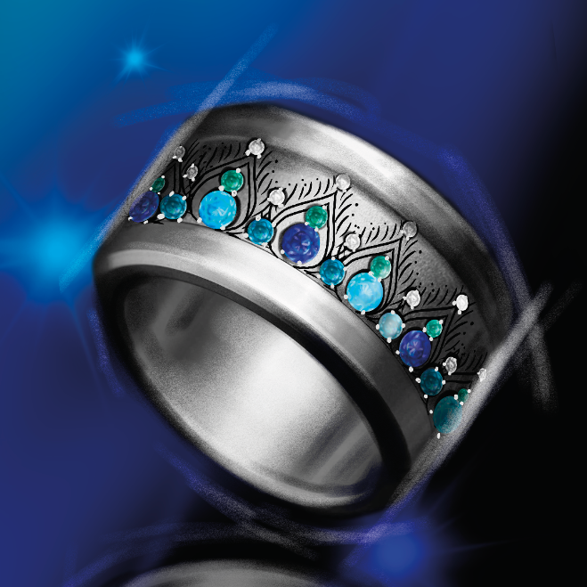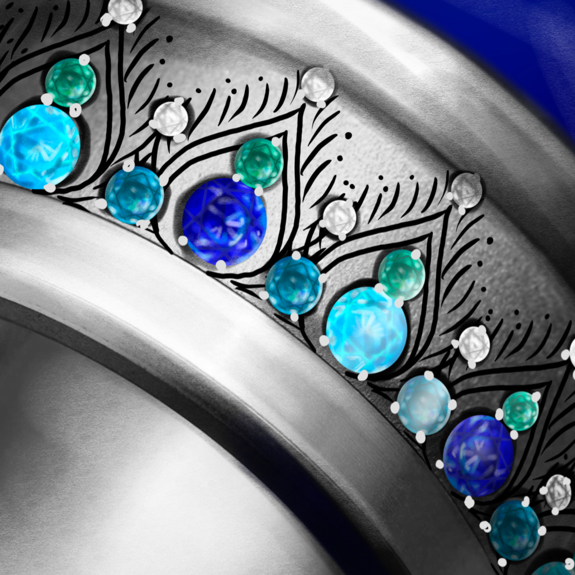 - Blaue Saphire: Diese Edelsteine verleihen einen königlichen Touch und zeitlose Eleganz und erinnern an den Reichtum der Pfauenfedern.