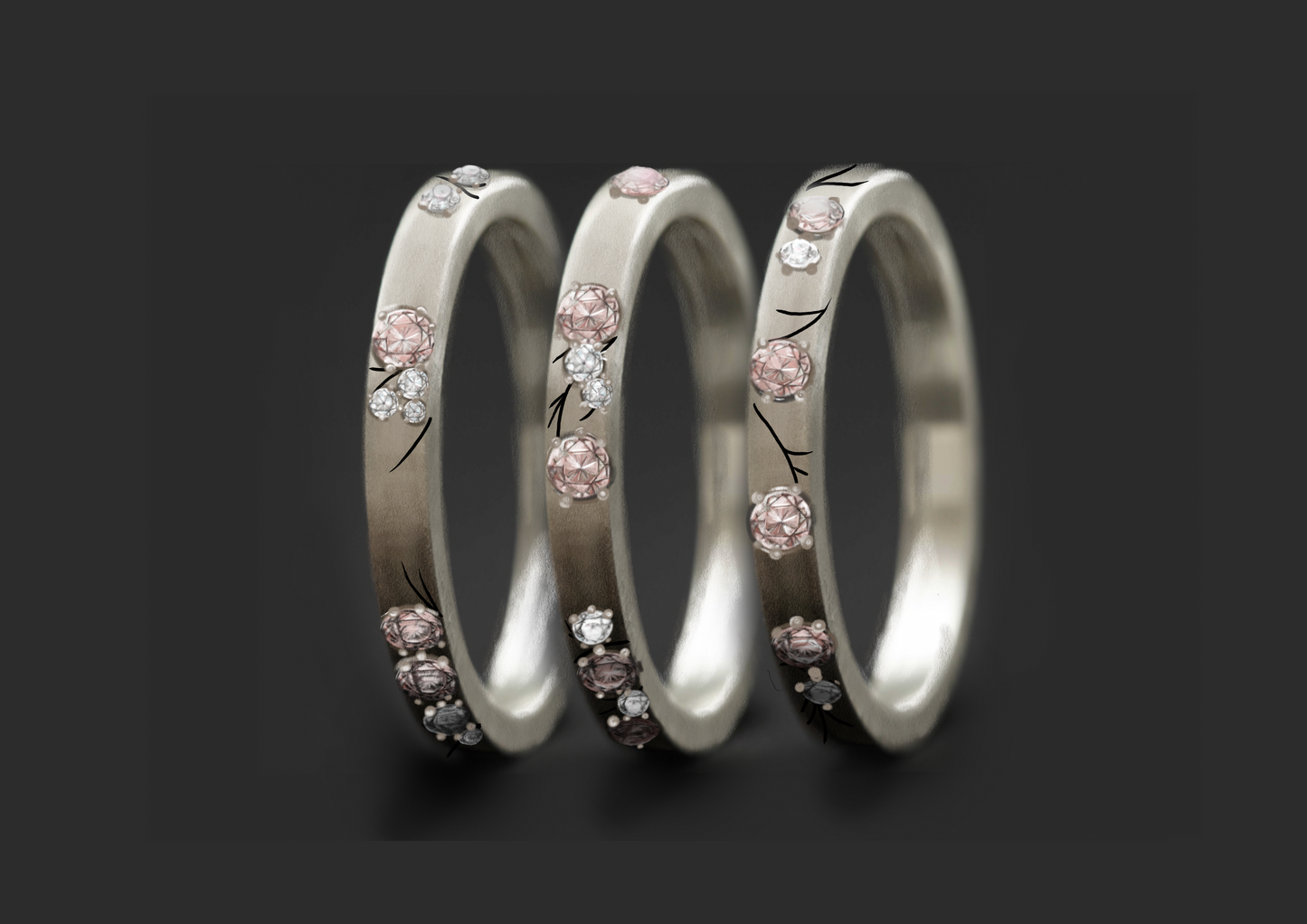 Set von 3 Innenringe aus Silber (3 Medium Addons) Hanami mit Diamanten und "Pur" rosa Diamanten für mood Luxus-Ring