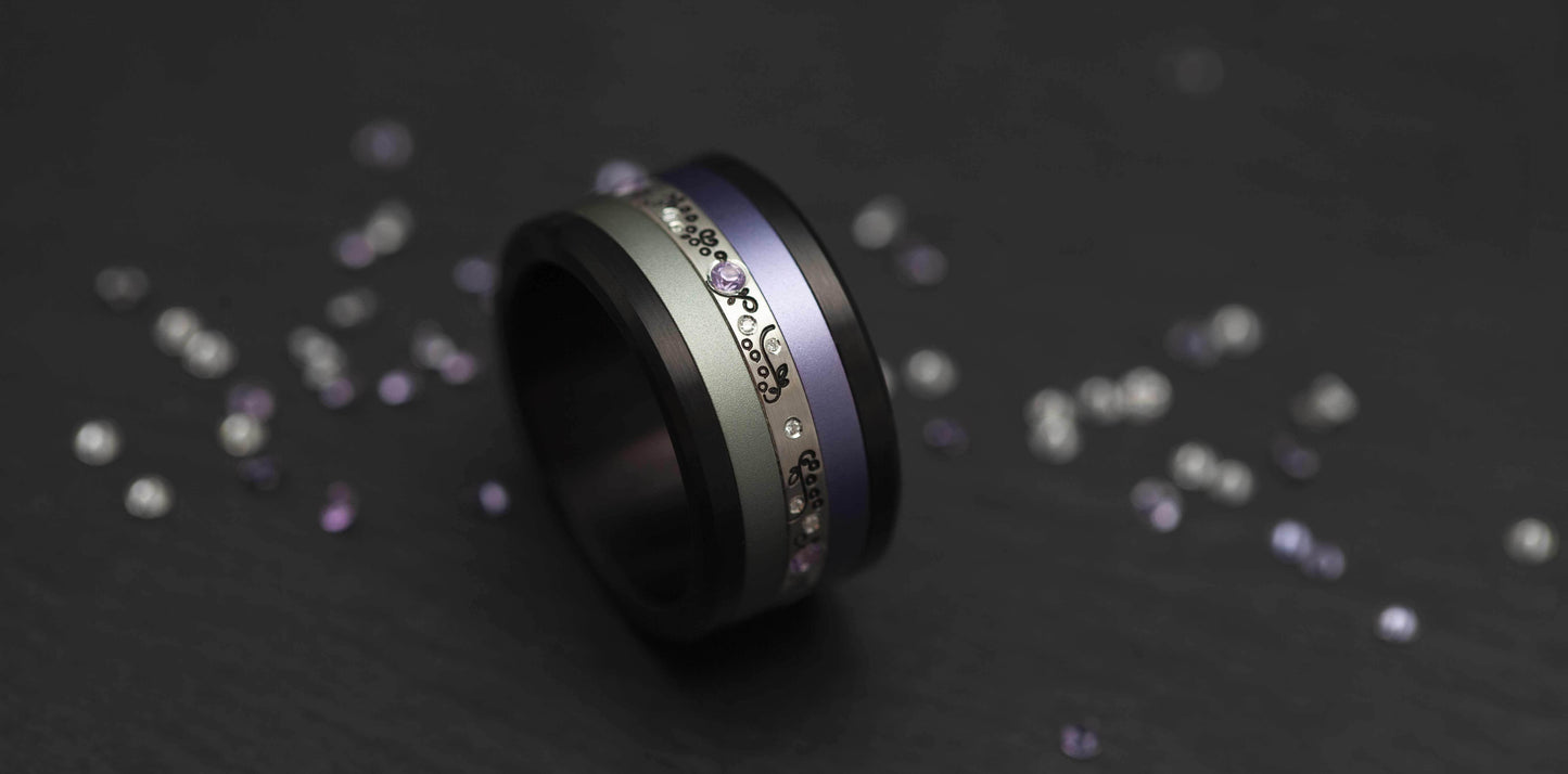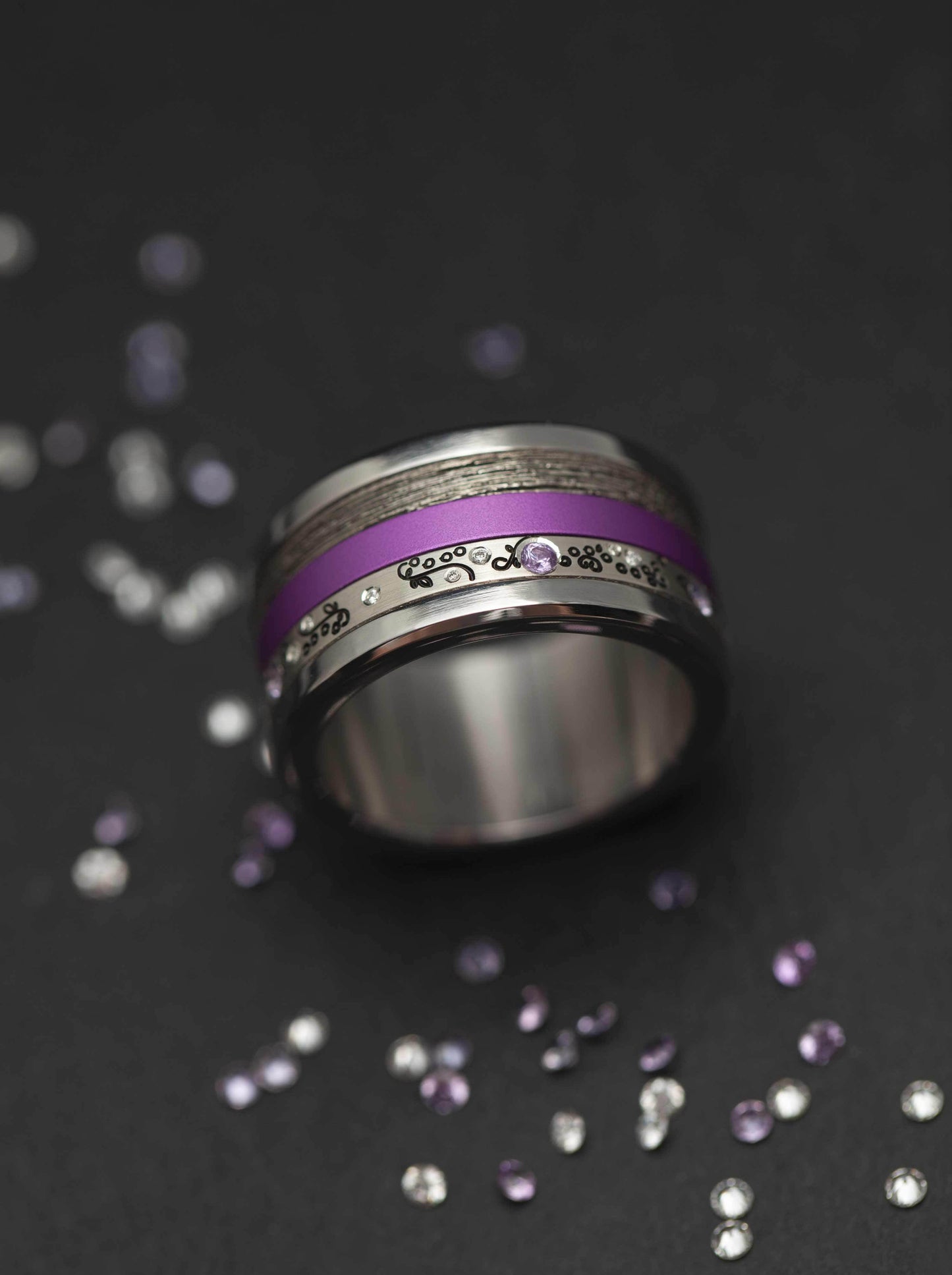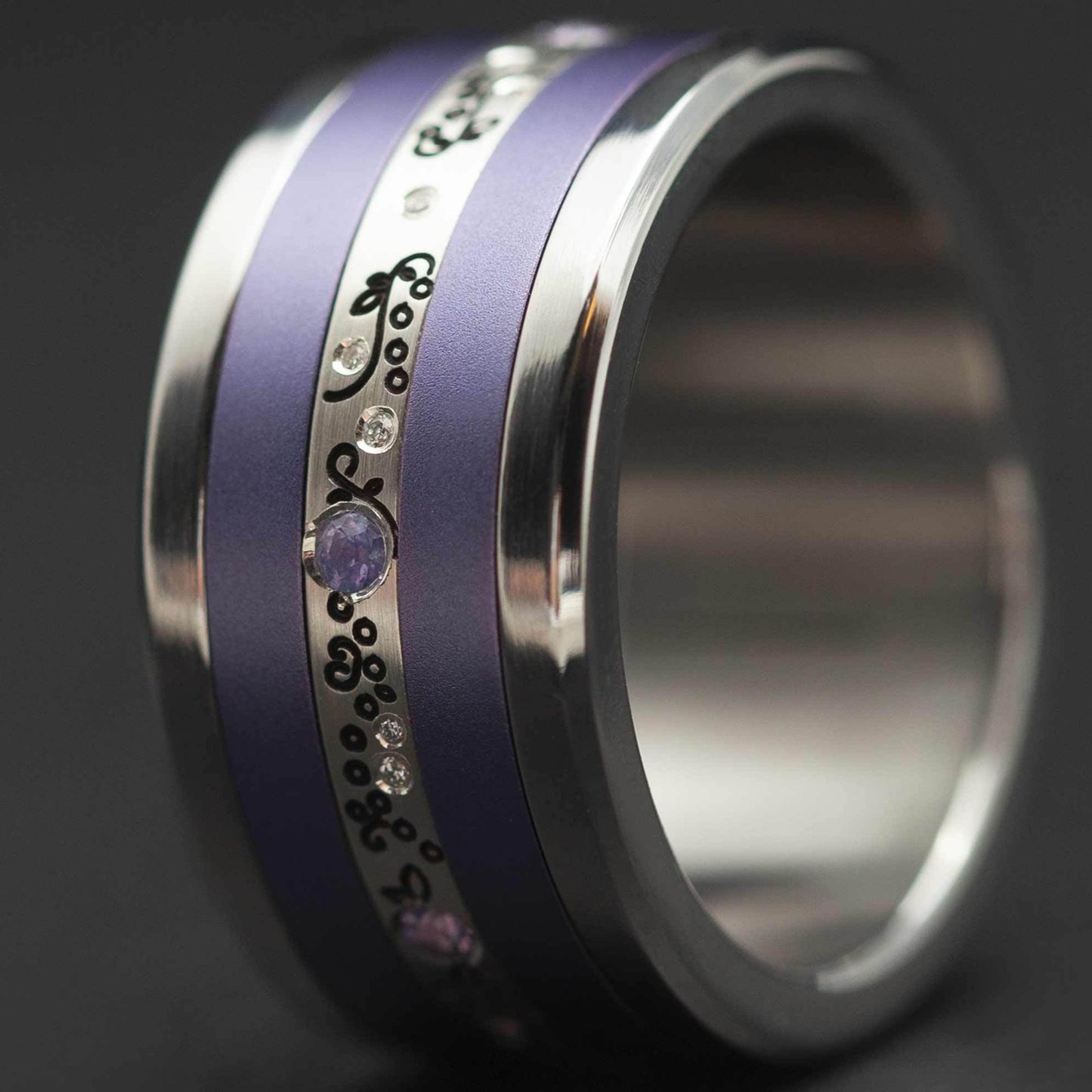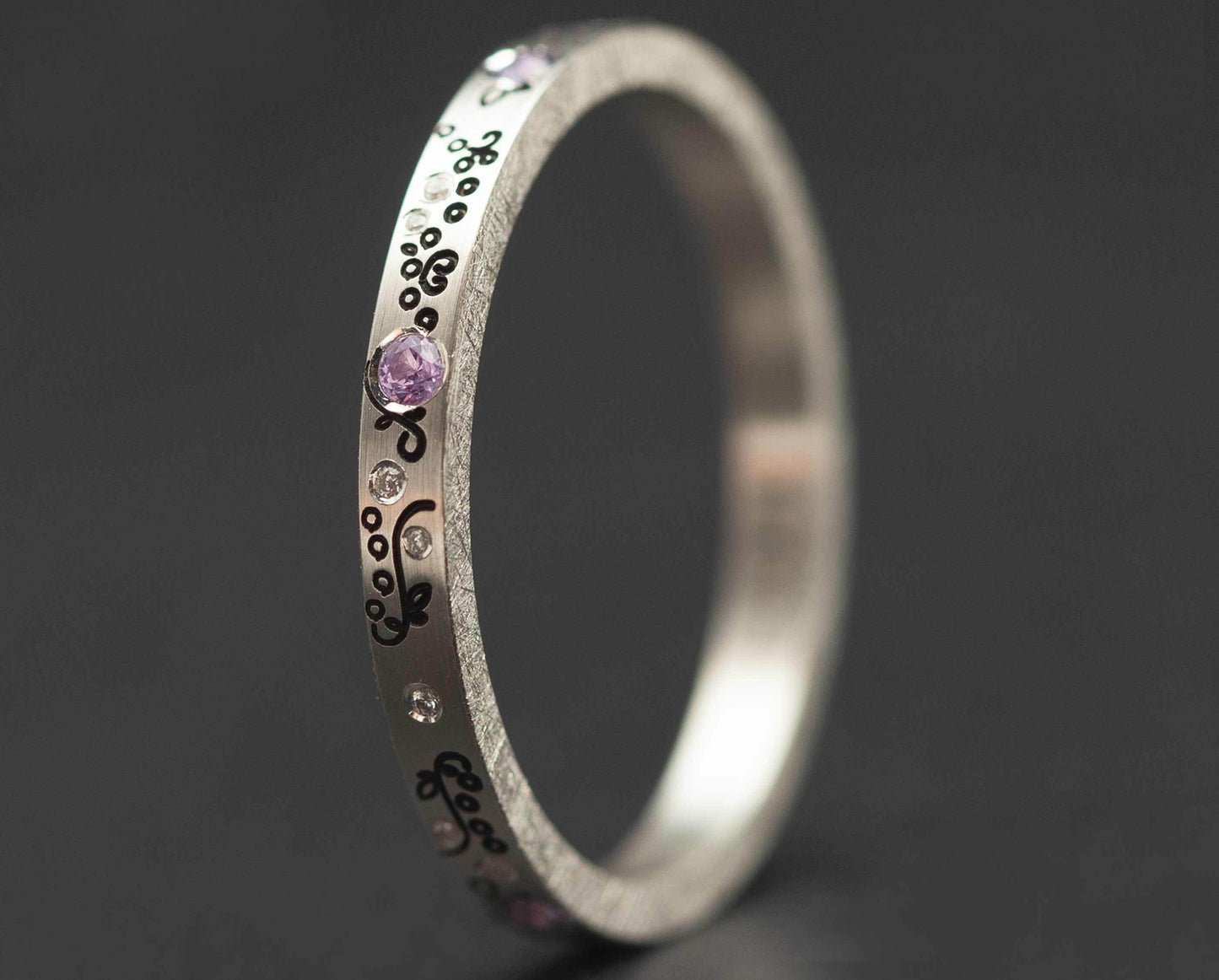 Cette pièce est sertie de 6 saphirs mauves clairs, de 10 diamants 0.8 mm et de 8 diamants 0.6mm.