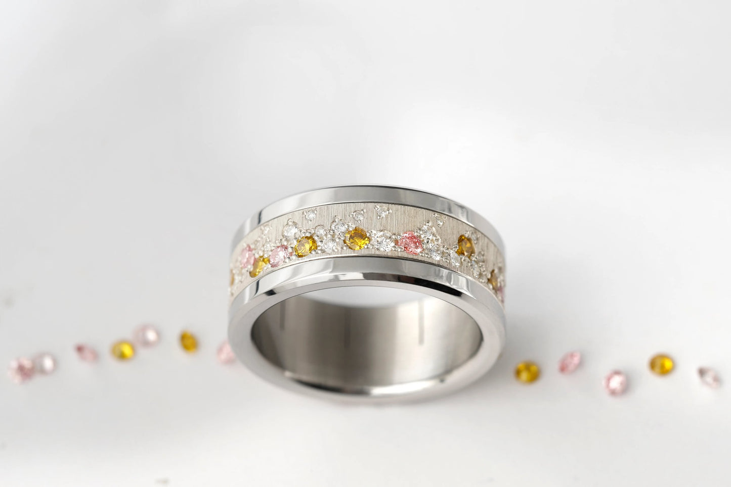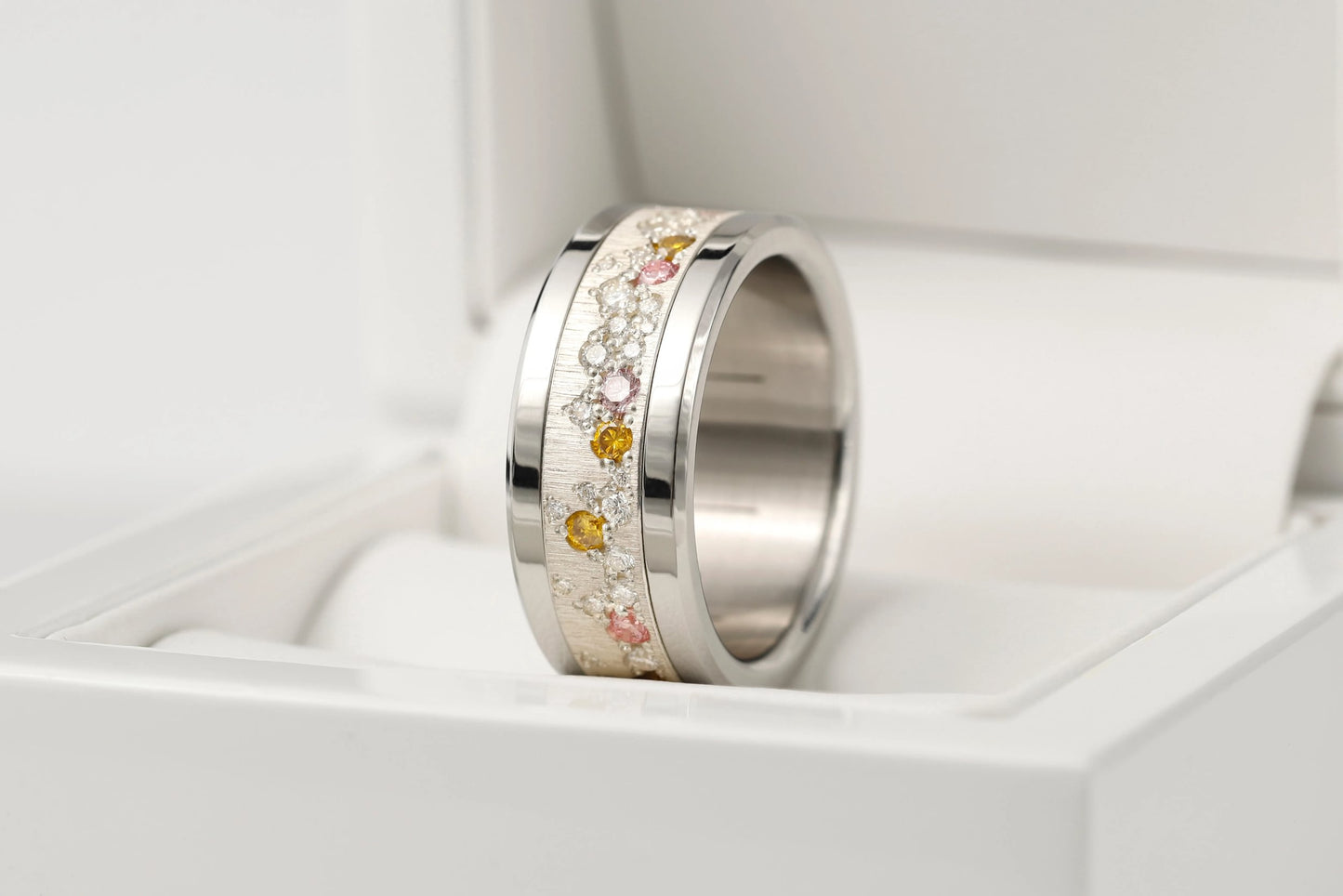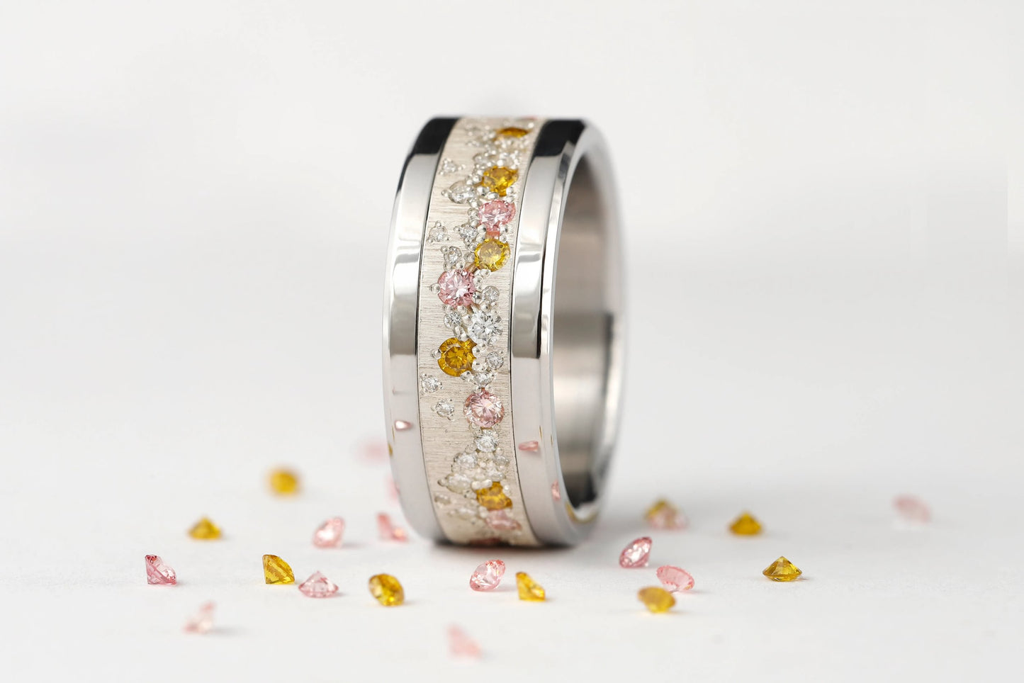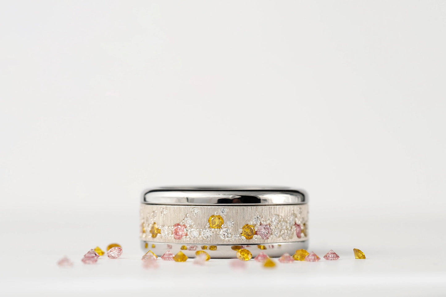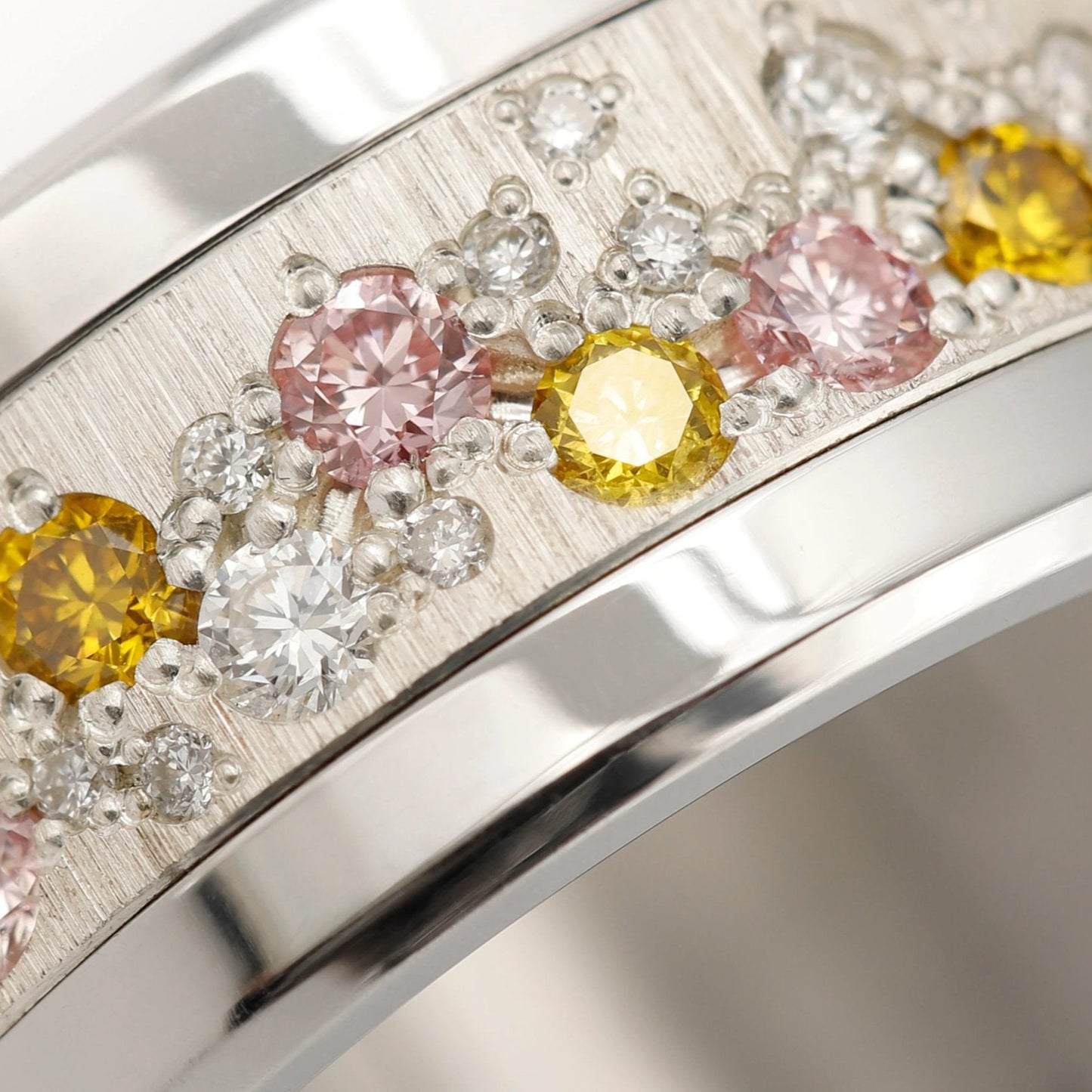 - Pierres précieuses : Diamants purs, diamants rose et jaune (pureté W/VS-SI, couleur G-H)