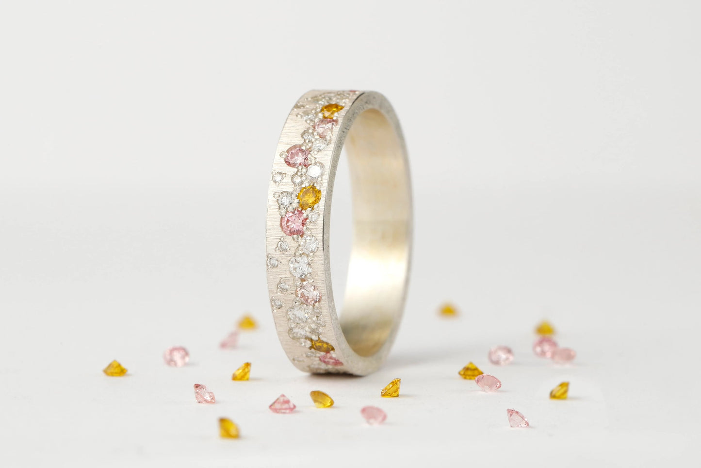 Découvrez la bague Mood Yarrow "Pur", une bague femme d'exception qui allie élégance et raffinement. Conçue pour les femmes en quête de luxe discret, cette bague en argent froissé est ornée de pierres précieuses soigneusement sélectionnées, notamment des diamants purs et des diamants rose et jaune provenant des montagnes de Zermatt.